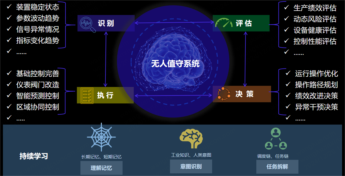無人值守能夠將企業較為稀缺的人力資源從復雜、繁瑣、重復的操作活動中解放出來,提升裝置運行水平、安全水平和效益,減少非計劃停工,對裝置的長周期、高效自主運行具有深遠意義,是化工裝置安、穩、長、滿、優高度自主運行的集中體現。區別于傳統的黑屏操作無人值守的關鍵在于裝置系統能夠具備識別-評估-決策-執行的自主能力,實現對外部的需求或干擾進行自主響應,同時又可對系統內部要素的完整性、健康性、穩定性進行自我管理,最終達到無需人工干預、實現無人值守的目標。