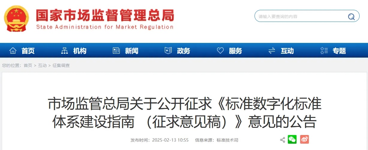 為深入貫徹落實黨中央、國務院關于推動標準化工作向數字化、網絡化、智能化轉型的決策部署,實施《國家標準化發展綱要》和《質量強國建設綱要》,充分發揮標準的基礎性、引領性作用,加快構建結構合理、層次分明、適應經濟社會高質量發展的標準數字化標準體系。市場監管總局起草了《標準數字化標準體系建設指南 (征求意見稿)》,現向社會公開征求意見,意見反饋截止日期為2025年3月12日。公眾可以通過以下途徑和方式提出意見: