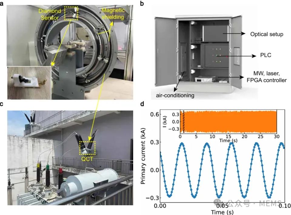 此外,該成果最終應用于安徽合肥110kV變電站的電流實時監測,成功實現對三相交流電路中單相電流的實時監測。該研究不僅攻克了金剛石量子傳感器的集成化關鍵技術,而且推動了量子傳感技術在工業領域的應用落地。