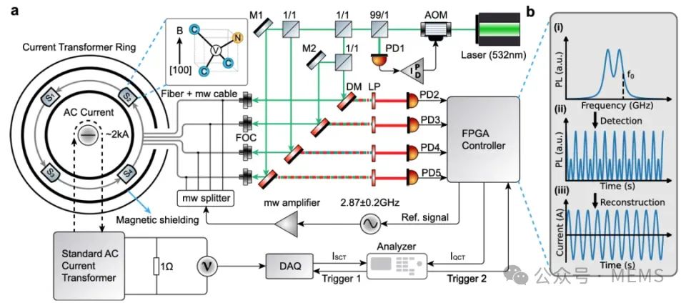 在電力系統中,高壓電流測量至關重要,其可靠性和準確性直接關系到高壓電流模式控制、節能和電力保護。然而,隨著高壓或超高壓電網的大規模發展,電網的寬帶振蕩和諧波共振問題日益嚴重,傳統測量方法難以在寬電流和溫度范圍內滿足高精度測量的要求。金剛石NV色心展現出諸多卓越特性,使其在磁場傳感領域得到廣泛應用,特別是磁場測量可被反演至NV色心能級共振頻率測量,使得金剛石傳感器在高精度電流測量方面頗具應用前景。但是目前金剛石量子傳感器還面臨著集成化過程中的性能下降等問題,導致其在實際應用中存在諸多限制。