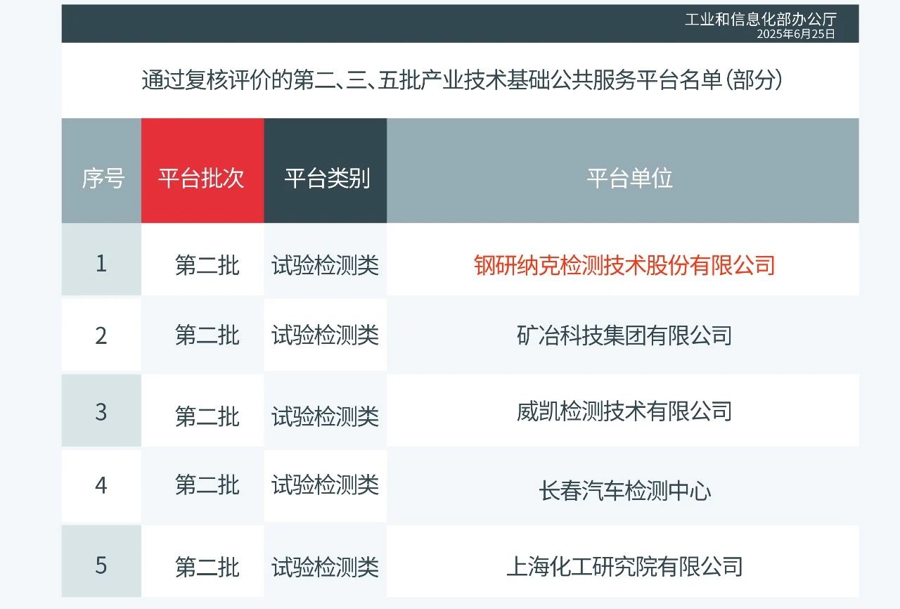 近期,國家工業和信息化部正式對外公布了第二、三、五批產業技術基礎公共服務平臺的復核通過名單。鋼研納克檢測技術股份有限公司憑借在工業(特殊鋼)產品質量控制與技術評價領域的深厚積累和突出貢獻,成功通過復核,再次彰顯鋼研納克作為國家級技術支撐平臺的領先地位。
