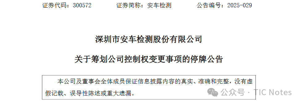 2025729日,深圳市安車檢測股份有限公司發布《關于籌劃公司控制權變更事項的停牌公告》,公告顯示,公司于今日收到控股股東及實際控制人賀憲寧的通知,其正在籌劃股權轉讓及控制權變更相關事宜,該事項可能導致公司控股股東和實際控制人發生變更。目前各方尚未簽署相關正式交易協議,擬就具體交易方案、協議等相關事項進行論證和磋商,具體情況以各方簽訂的相關正式交易協議為準。