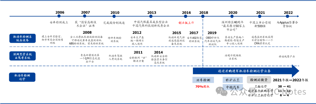 據悉,安車檢測成立于2006年,2010年完成股份制改造,2016年于創業板上市。公司為機動車檢測綜合服務商,業務覆蓋全國31個省市,初期主業圍繞機動車檢測系統及檢測行業聯網監管系統,為業內少數可提供系統方案設計、安裝集成、運營維護及行業監管等全鏈條服務的檢測設備供應商之一,下游客戶主要包括全國各地的機動車檢驗機構、汽車制造廠、科研機構等。2018年公司通過收購興車檢測70%股權切入機動車檢測站運營,加速向下游產業鏈延伸,產業鏈布局持續完善。