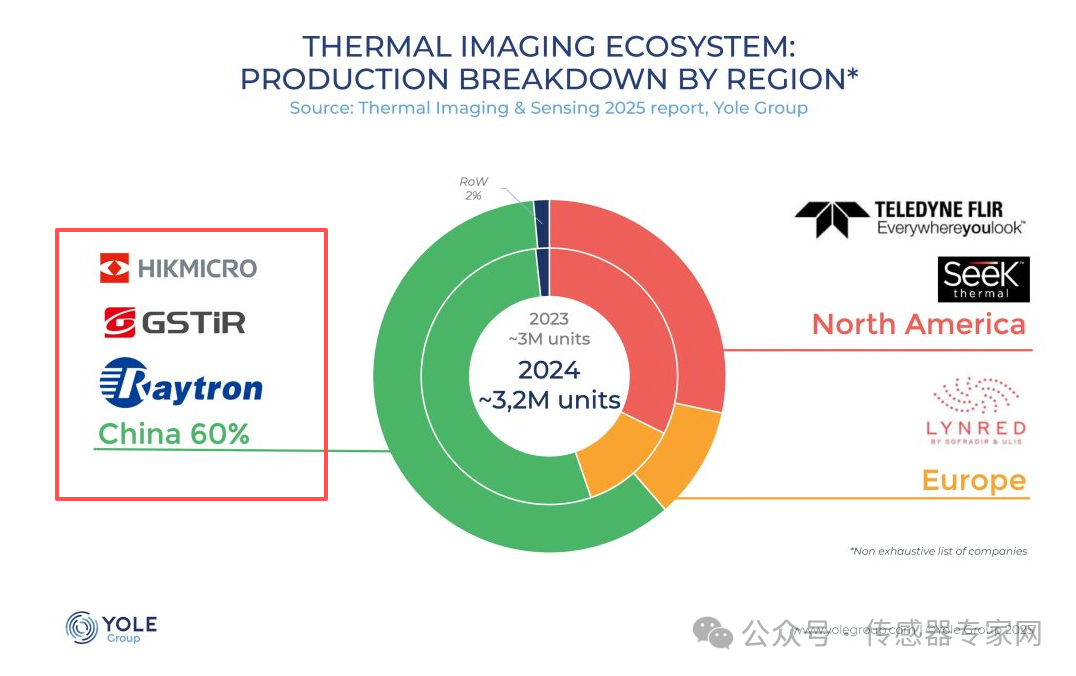 根據(jù)Yole 8月份剛剛發(fā)布的最新《Thermal Imaging and Sensing 2025》(《熱成像與傳感2025》)報(bào)告顯示,以??滴⒂埃?/span>Hikmicro)、高德紅外(Gstir)、睿創(chuàng)微納(Raytron)為代表的中國(guó)紅外傳感公司,占據(jù)全球60%的市場(chǎng)份額。