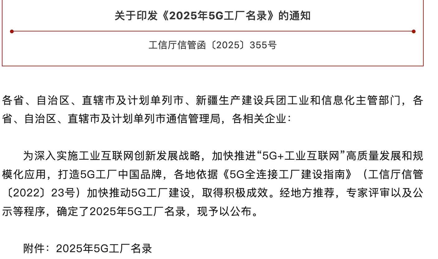 為貫徹落實工業互聯網創新發展戰略,工信部自《5G全連接工廠建設指南》發布以來,持續推動“5G工廠百千萬行動”提質升級。旨在通過打造一批高水平5G工廠,形成示范效應,加速各行各業“智改數轉網聯”進程。20255G工廠名錄的遴選,既是對前期建設成果的系統總結,也是為中國制造業高質量發展樹立新標桿。