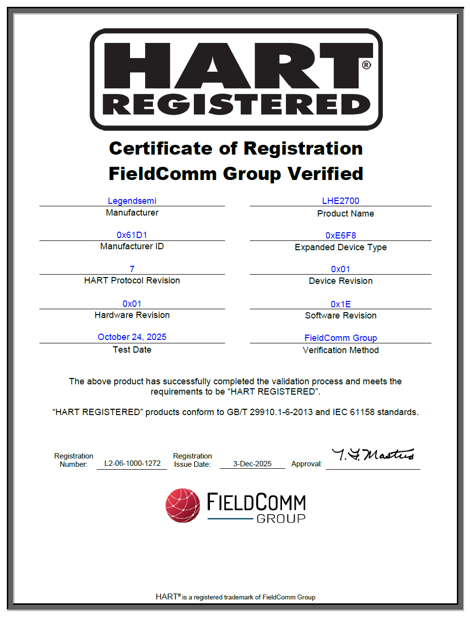 近日,領慧立芯旗下LHE2700 集成精密振蕩器的低功耗 HART 調制解調器,成功通過國際權威機構 FieldComm Group HART® 通信協議認證。這一里程碑式的突破,不僅標志著 LHE2700 在工業通信協議兼容性、技術可靠性上達到國際標準,更意味著國產工業級模擬芯片在關鍵領域實現了與國際先進水平的精準對標,為工業自動化設備的國產化升級注入強勁 “芯” 動力。
