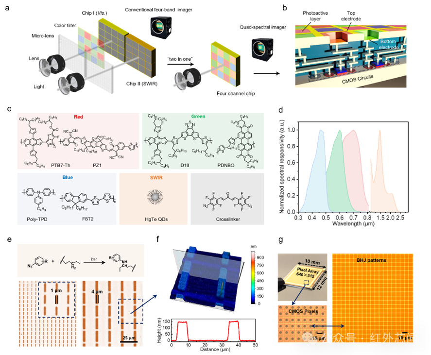 1聚焦多通道圖像傳感器的核心設(shè)計與制備基礎(chǔ),系統(tǒng)呈現(xiàn)集成架構(gòu)、材料選型、圖案化機(jī)理及CMOS兼容特性。對比采用可見光圖像傳感器+短波紅外圖像傳感器的分離架構(gòu),這項研究聚焦單一集成芯片設(shè)計,將可見光像素與短波紅外像素集成于單芯片,解決了復(fù)雜分光光路設(shè)計難題,且通過直接光刻圖案化工藝,實現(xiàn)多波段探測像素單片集成,解決了可見光與短波紅外像素CMOS工藝的兼容性難題。利用圖案化技術(shù),本體異質(zhì)結(jié)(BHJ)及膠體量子點像素可以與讀出電路(ROIC)單片集成,具有640×512像素陣列,像素間距為15 μm。
