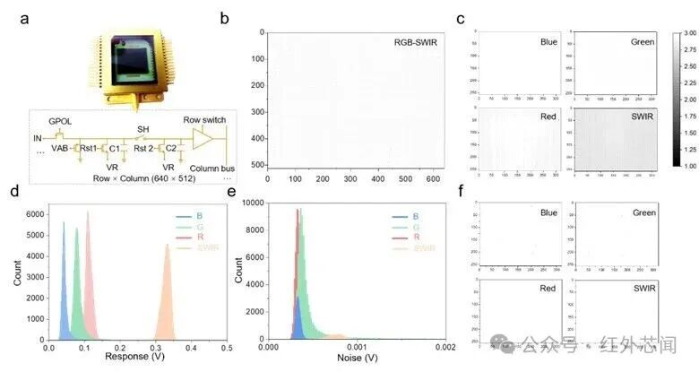 所提出的直接光圖案化方法與標(biāo)準(zhǔn)CMOS制造工藝完全兼容。研究人員將基于聚合物的三色可見光像素與基于碲化汞量子點的短波紅外像素單片集成到同一讀出電路上。這種混合集成策略使得四通道成像器件得以實現(xiàn),其中可見光和短波紅外像素以2×2陣列排列,每個子陣列的有效分辨率為320×256