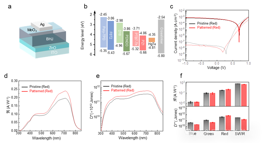 能圖2主要展示圖案化后單元像素器件性能表征。非破壞性圖案化方法對于保持高性能光電探測器的光電完整性至關(guān)重要。為了評估光電二極管架構(gòu)中像素圖案化的兼容性,采用有機(jī)異質(zhì)結(jié)和碲化汞量子點作為活性層,制備了單元器件,并對圖案化前后的電流曲線、響應(yīng)光譜、比探測率、響應(yīng)度等關(guān)鍵指標(biāo)進(jìn)行了系統(tǒng)表征。