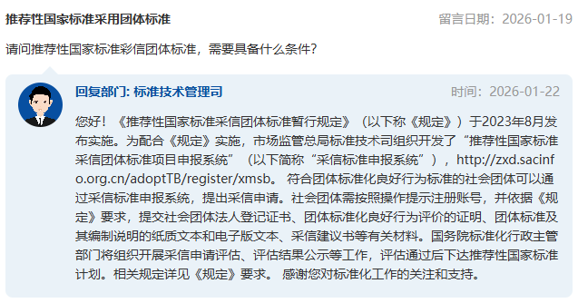 近期,有網友在市場監(jiān)管總局網站公眾留言系統咨詢關于“國家標準引用、采用團體標準”的問題,市場監(jiān)管總局給予了答復。