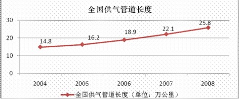 由于瓶裝氣由單獨(dú)的配套計(jì)量?jī)x器,同時(shí)我國(guó)《城鎮(zhèn)燃?xì)饧夹g(shù)規(guī)范》規(guī)定使用管道燃?xì)獾挠脩?hù)應(yīng)設(shè)置燃?xì)庥?jì)量裝置。因此,燃?xì)夤艿赖慕ㄔO(shè)將直接影響燃?xì)獗硎袌?chǎng)。根據(jù)《全國(guó)城市燃?xì)夤芫W(wǎng)改造規(guī)劃(2008-2010)》,1990年至2006年,城市燃?xì)庑袠I(yè)供求管道長(zhǎng)度從2.4萬(wàn)公里增加到18.9萬(wàn)公里,增加了近7倍。2002年至2006年,城市燃?xì)夤艿滥暝鲩L(zhǎng)1.42-2.74萬(wàn)公里,平均增長(zhǎng)率超過(guò)13%,而天然氣管道的平均增長(zhǎng)率則超過(guò)20%。