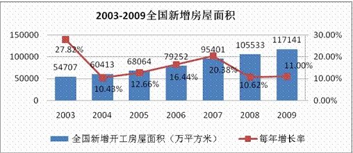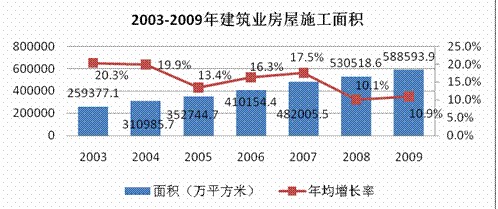 燃?xì)獗順I(yè)務(wù)與房產(chǎn)市場(chǎng)發(fā)展密切相關(guān)。2003年-2009年建筑房屋施工面積由259,377萬(wàn)平方米增加到588,593萬(wàn)平方米,年均增長(zhǎng)14.6%。