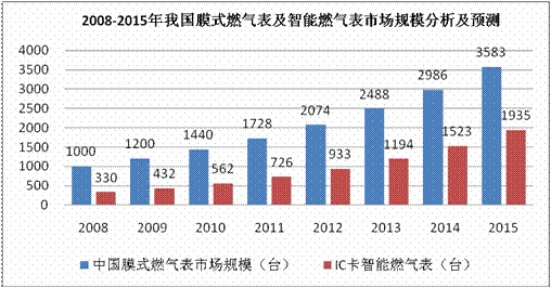 近幾年,我國(guó)儀器儀表及文化、辦公用行業(yè)發(fā)展迅速,2009年我國(guó)儀器儀表及文化、辦公用總產(chǎn)值達(dá)到5977億元。根據(jù)第五次全國(guó)人口普查數(shù)據(jù),我國(guó)共有家庭3.48億戶(hù),城鎮(zhèn)人口約占總?cè)丝诘?5.68%,因此推算我國(guó)城鎮(zhèn)家庭約有1.58億戶(hù)。靜態(tài)地估計(jì),國(guó)內(nèi)民用燃?xì)獗淼氖袌?chǎng)容量約為1.5億臺(tái),目前我國(guó)處于傳統(tǒng)燃?xì)獗硐蛑悄苋細(xì)獗淼霓D(zhuǎn)換階段,IC卡燃?xì)獗怼o(wú)線燃?xì)獗砗虶PRS遠(yuǎn)程燃?xì)獗O(jiān)控抄表系統(tǒng)將成為主要產(chǎn)品。根據(jù)國(guó)家計(jì)量檢定規(guī)程~JJG577—2005《膜式燃?xì)獗怼芬?guī)定:以天然氣為介質(zhì)的燃?xì)獗硎褂闷谙抟话悴怀^(guò)10年,以人工燃?xì)狻⒁夯蜌獾葹榻橘|(zhì)的燃?xì)獗硎褂闷谙抟话悴怀^(guò)6年。因此燃?xì)獗硇袠I(yè)是一個(gè)持續(xù)發(fā)展的行業(yè),未來(lái)的市場(chǎng)前景廣闊。保守的估計(jì),2008年以后國(guó)內(nèi)每年更新或新安裝的燃?xì)獗?000萬(wàn)臺(tái)以上,其中智能燃?xì)獗碚嫉?0%以上。預(yù)計(jì)2010年以后國(guó)內(nèi)市場(chǎng)對(duì)燃?xì)獗淼哪晷枨罅靠蛇_(dá)1500萬(wàn)臺(tái)以上,其中智能燃?xì)獗韺⒄伎傂枨蟮?0%左右,而且需求量呈逐年上升的趨勢(shì),每年的增長(zhǎng)率可達(dá)30%-35%。到2015年中國(guó)燃?xì)獗淼目傂枨罅靠蛇_(dá)到3500-3700萬(wàn)臺(tái)左右,其中智能燃?xì)獗砑s占總需求量的50%-55%左右。本公司產(chǎn)品自1998年投放市場(chǎng)以來(lái),大量的在線產(chǎn)品已經(jīng)進(jìn)入更換期,因此在未來(lái)智能燃?xì)獗砀鼡Q市場(chǎng)中將釋放出巨大的市場(chǎng)潛力。