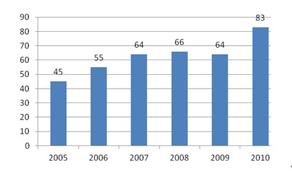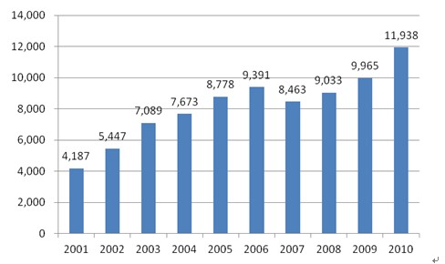 圖11:2005-2010我國家用電冰箱產量(萬臺)