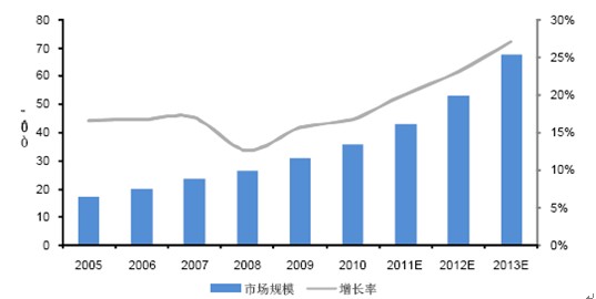 根據賽迪顧問《2009-2010 年中國社區安防電子市場研究》預測,2013年我國社區安防電子市場規模將達到517億元,相比2009年統計的313億元,4年復合增速為13.4%。